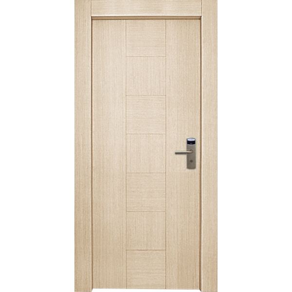 Ulazna vrata za hotele, debljine vratnog krila 65mm, zvučno izolovana, protivpožarna( T=60mm). Furnirana su hrastovim fineline furnirom( intarzija). Vrata su opremljena DIALOCK mehanizmom za kontrolu pristupa. Bajc efekat beljeni hrast.